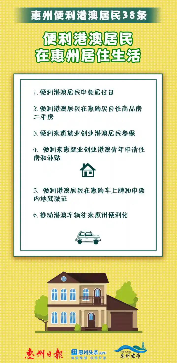 在便利港澳居民在惠州居住生活方面,《便利港澳居民在惠州发展若干措施》提出包括便利港澳居民申领居住证,便利港澳居民在惠购买自住商品房、二手房,便利来惠就业创业港澳居民参保,便利来惠就业创业港澳青年申请住房和补贴,便利港澳居民在惠购车上牌和申领内地驾驶证,推动港澳车辆往来惠州便利化等6项措施。