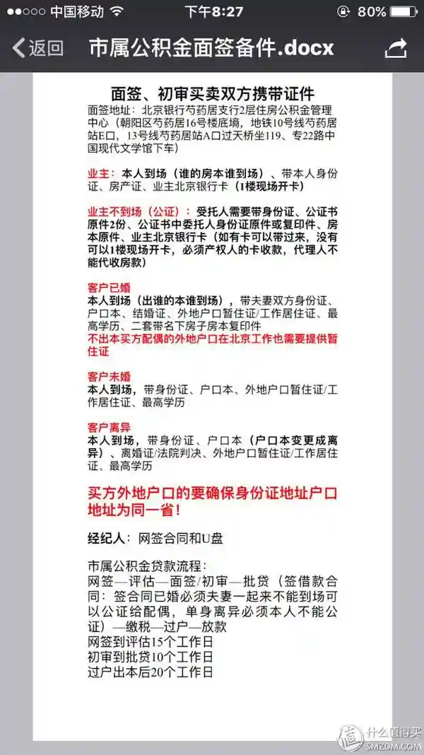 下图是中介公司给我发的关于面签的提醒,发给各位瞅瞅,省得楼主码字了下面公积金面签地址,只是北京市朝阳区的,在芍药居那,地铁不能直达,所以最好选择自己开车或者公交车,打车等方式。